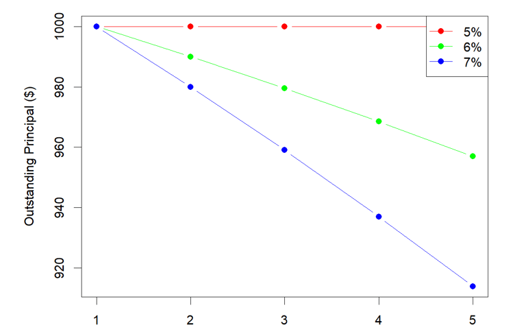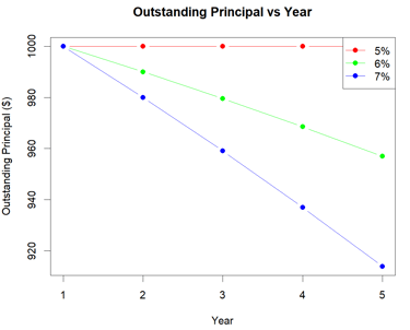 You enter the bond infomation and get the outstanding principal and cumulative interest paid vs time. By deafalt, the axis are adjsuted for each plot. However, you may keep it unchanged from the previous plot to compare the effect of parameters. Par is 1000 for all plots